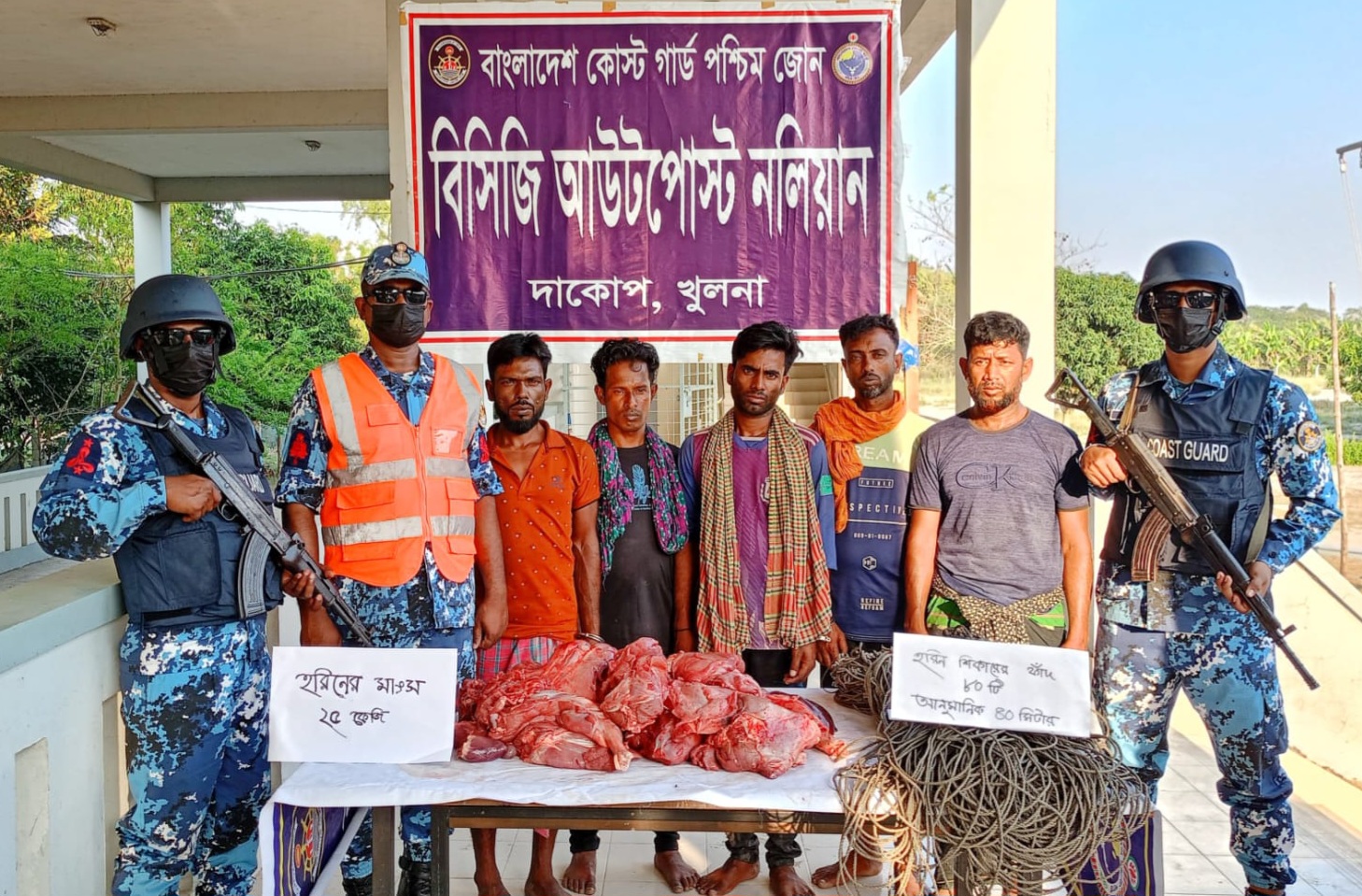 বোটটি তলাশি করে ২৫ কেজি হরিণের মাংস, হরিণ শিকারের ৮০টি ফাঁদসহ ৫ শিকারীকে আটক করা হয়। কোস্ট গার্ড পশ্চিম জোন মোংলা সদর দপ্তরের মিডিয়া কর্মকর্তা লেফটেন্যান্ট মাহবুব হোসেন এক প্রেস নোটে এ তথ্য নিশ্চিত করেন।