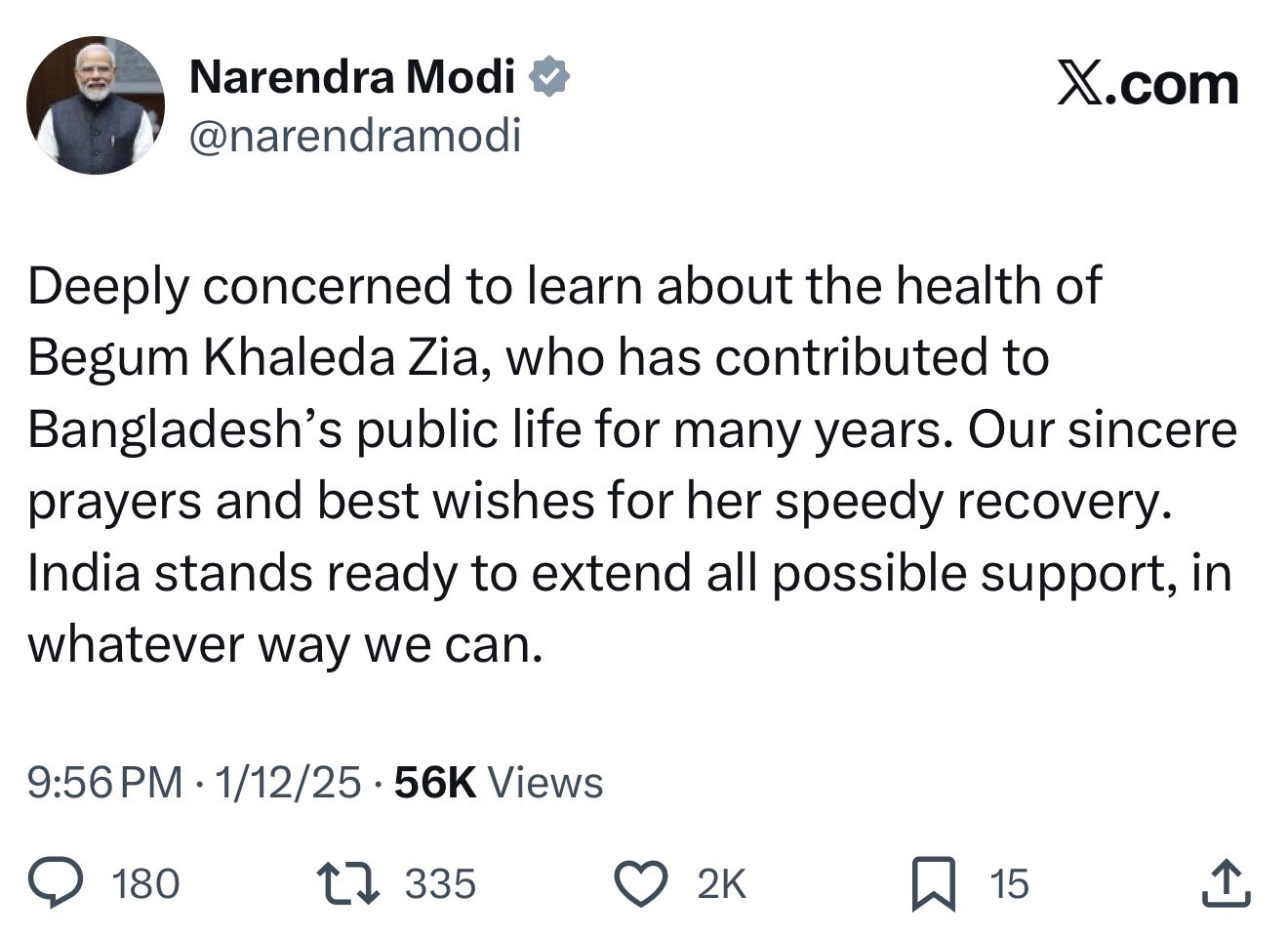 বাংলাদেশের সাবেক প্রধানমন্ত্রী ও বিএনপির চেয়ারপার্সন বেগম খালেদা জিয়ার অসুস্থতা নিয়ে গভীর উদ্বেগ প্রকাশ করেছেন ভারতের প্রধানমন্ত্রী নরেন্দ্র মোদি। এক্ষেত্রে ভারত ‘যেভাবেই সম্ভব সকল প্রকার সহায়তা প্রদান করতে প্রস্তুত’ বলেও জানিয়েছেন তিনি।